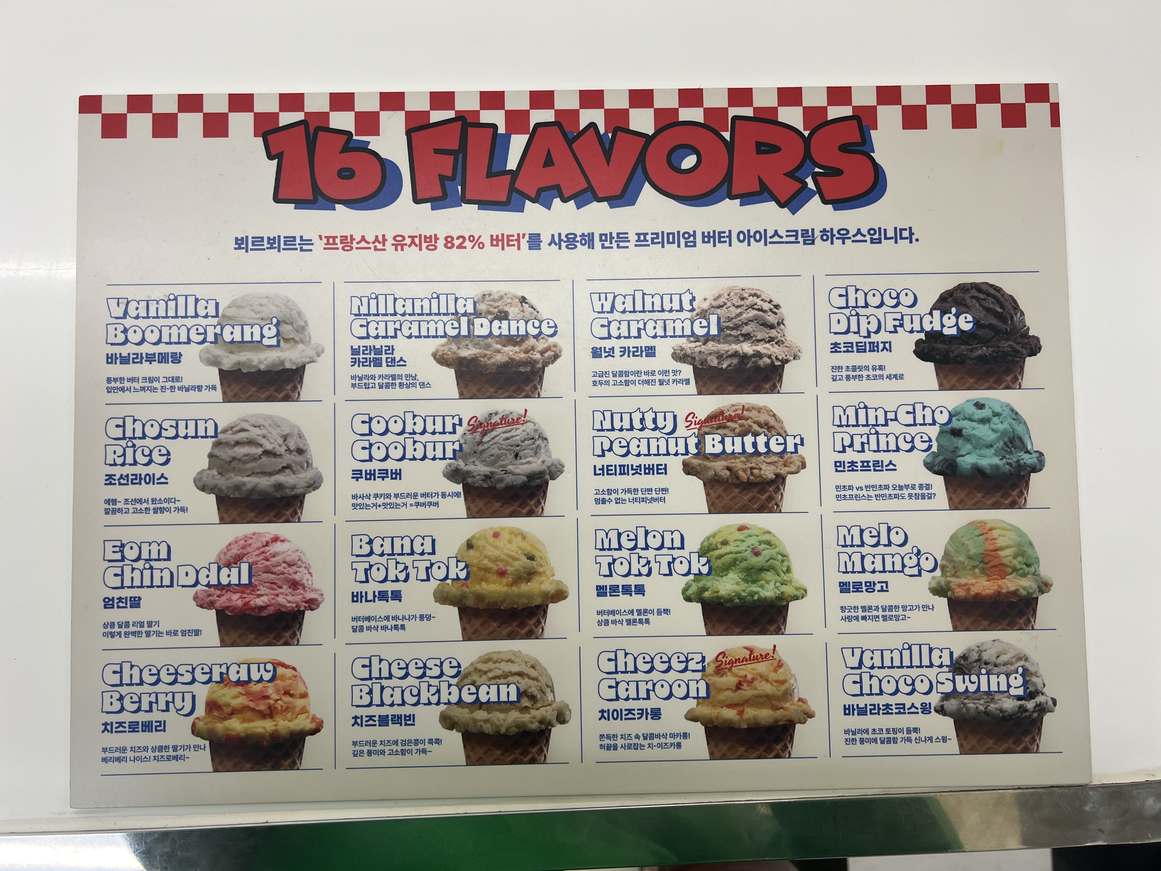 16개 맛이 있고, 프랑스산 유지방 82% 버터를 사용한 프리미엄 버터 아이스크림이라고 한다.