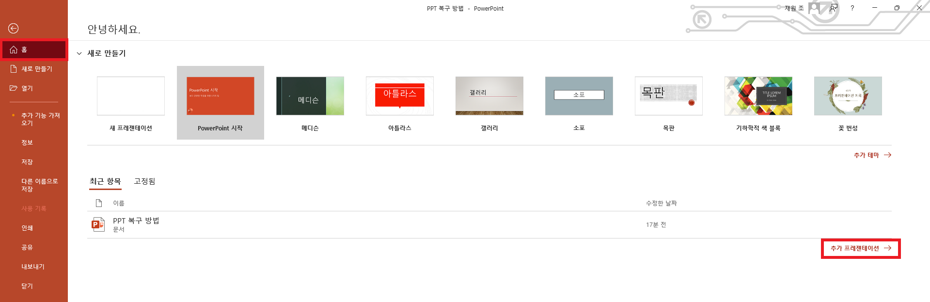 추가 프레젠테이션 -> 저장하지 않은 프렌젠테이션 복구