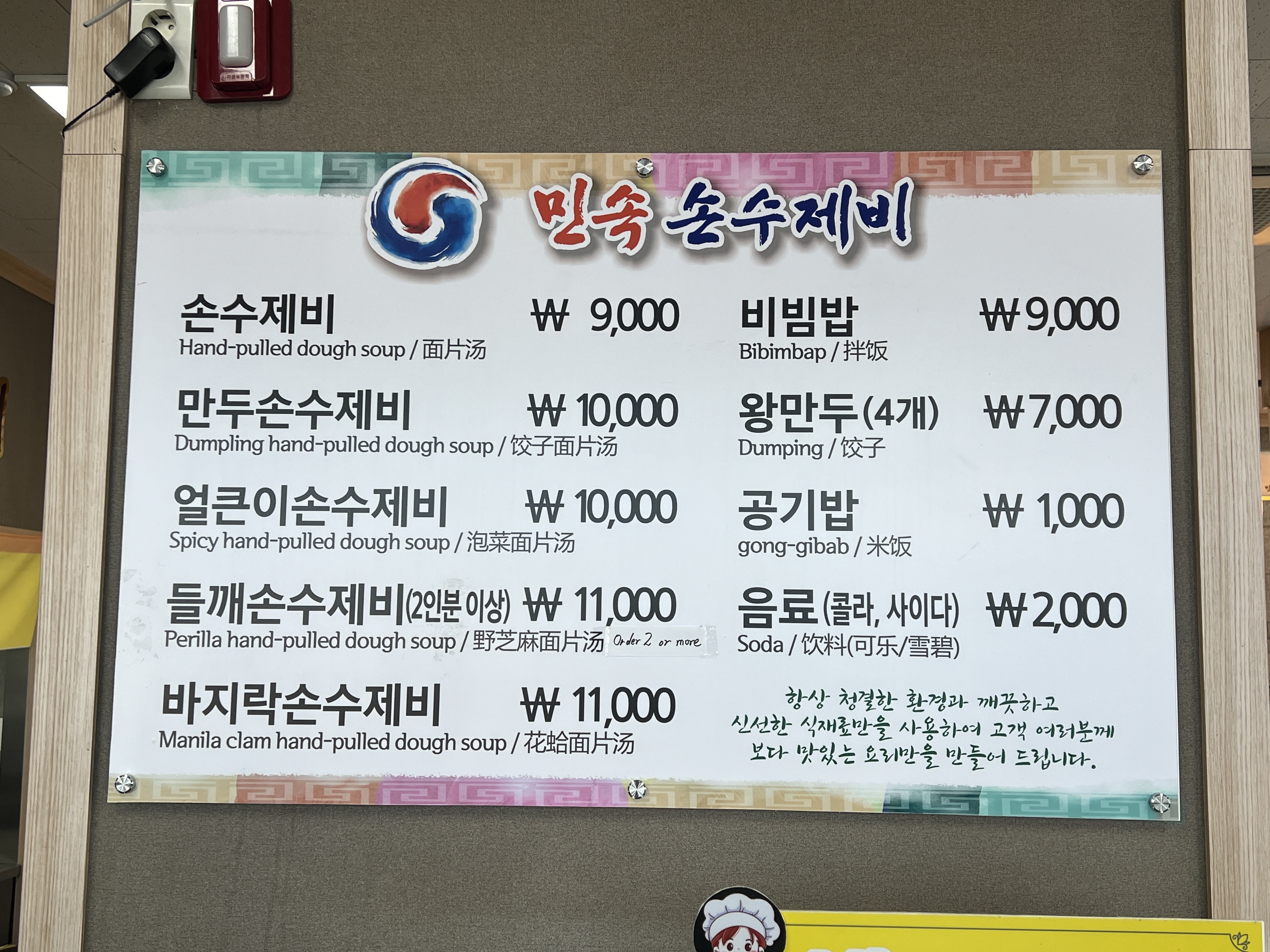민속 손수제비 메뉴판