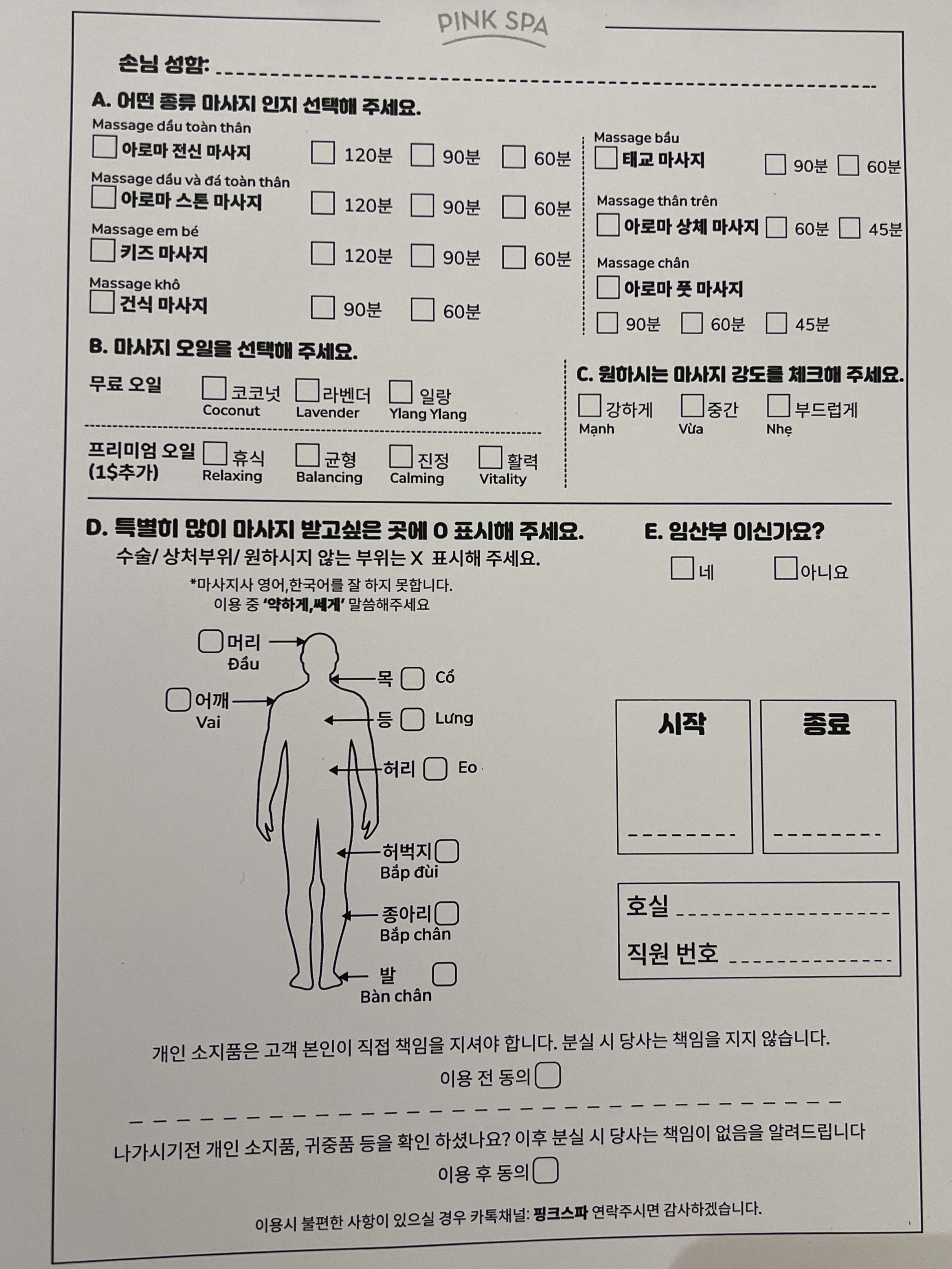 자리에 앉으면 마사지에 관련된 간단한 설문지를 작성한다.